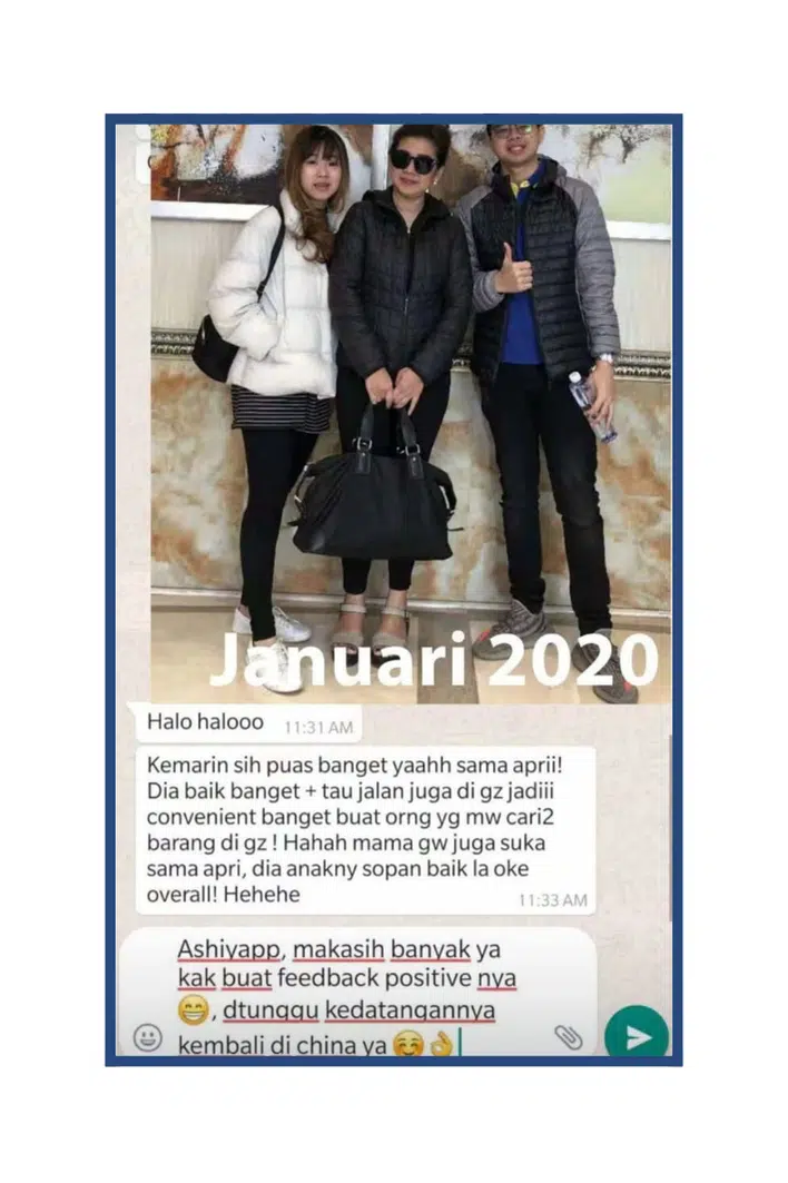 Kemarin sih puas banget ya sama Apri! Dia baik banget dan tau jalan di Guangzhou, jadi convenient banget buat orang yang mau cari barang. Mama gw juga suka sama Apri, anaknya baik dan sopan. Overall oke banget tripnya!